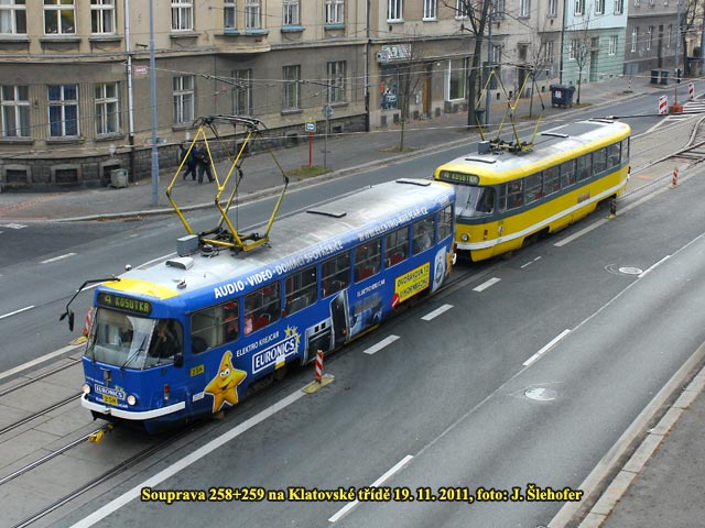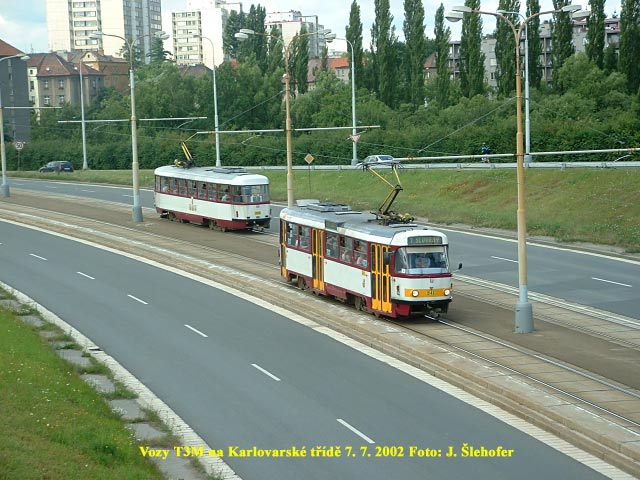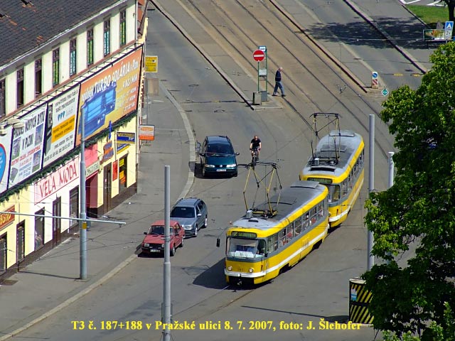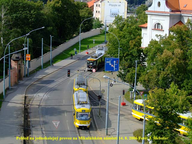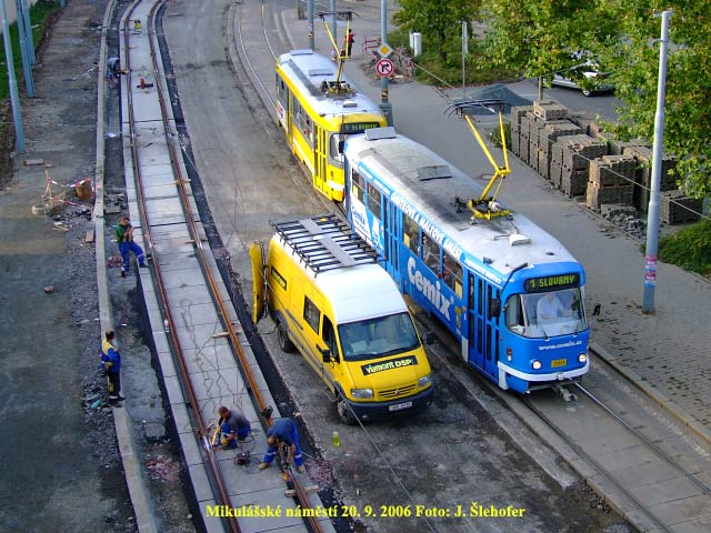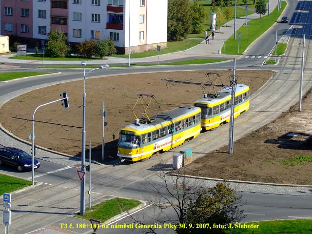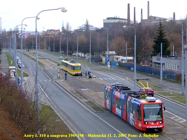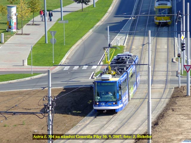 Foto: M. Klas Již neexistující souprava 199+189 mezi viadukty u nádraží 18. 3. 2000 Pohled na jednokolejný provoz na Mikulášském náměstí 14. 8. 2006 Kolejový přejezd přes Slovanskou třídu 18. 6. 2006 Pohled na Slovanskou třídu 14. 8. 2006 Souprava 260+261 na Slovanské třídě při rekonstrukci kolejiště 20. 9. 2006 Setkání vozů T3M na Karlovarské třídě 7. 7. 2002 Astra č. 302 - Rondel - 7. 7. 2002 Rondel - obnovení tramvajového provozu po povodních - 15. 8. 2002 Pohled na odstavené vozy v obratišti Malesická 9. 4. 2006 Astra otáčející se v Malesické 28. 10. 2000 Astra č. 310 se soupravou 196+198 - Malesická 11. 2. 2007 Zastávka ulice Karla Steinera se soupravou 254+255 - 19. 9. 2004