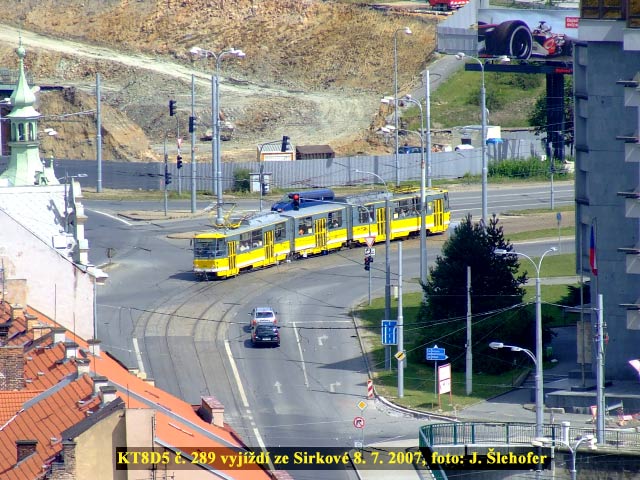 Pohled na vůz KT8D5 jedoucí z Palackého ulice při rekonstrukci sadů Pětatřicátníků 26. 3. 2003 Souprava 202+192 projíždí přes sady Pětatřicátníků v době jejich rekonstrukce 21. 5. 2003