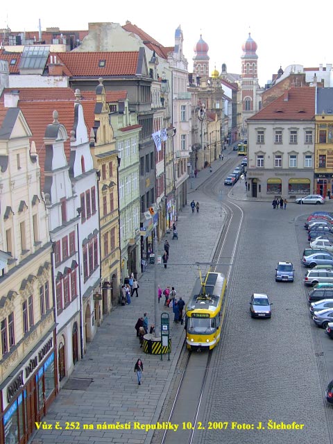 Pohled na sady Pětatřicátníků před zahájením rekonstrukce 1. 4. 2002 Souprava 284+285 sjíždí kolem divadla do již neexistující stanice U Synagogy 1. 4. 2002 Souprava 270+271 z okna plzeňské radnice, aneb jak vidí tramvaje páni zastupitelé 28. 10. 2006 Vůz č. 252 na náměstí Republiky 10. 2. 2007