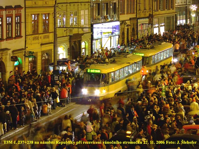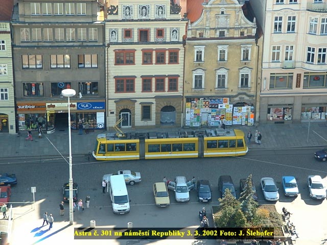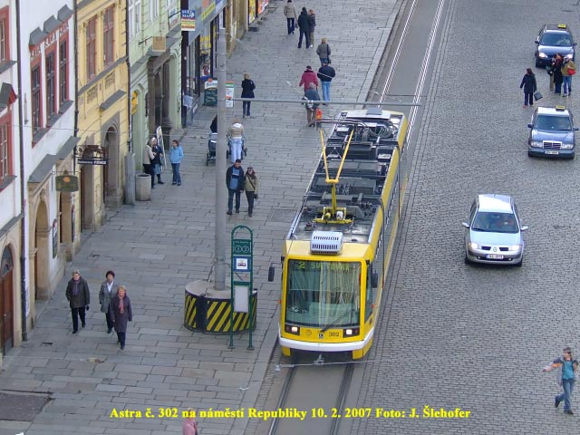 Astra č. 302 na náměstí Republiky 10. 2. 2007 K3R-NT č. 311 na náměstí Republiky 18. 10. 2006 T3M č. 237+238 na náměstí Republiky v době rozsvícení vánočního stromečku 27. 11. 2006 Astra č. 301 na náměstí Republiky 30. 3. 2002