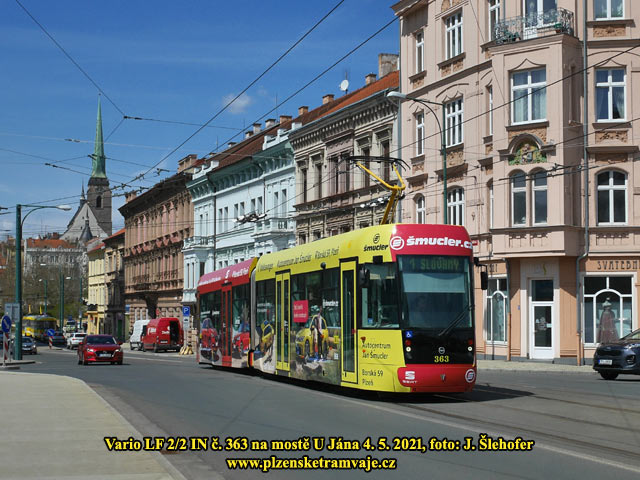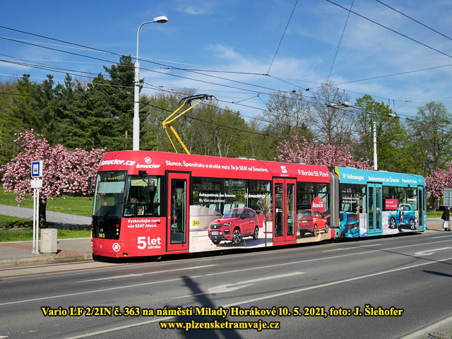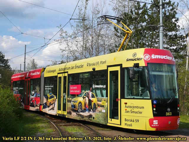 Na jaře 2021 dostává Inka č. 363 barevnou reklamu na Autocentrum Šmucler. Na snímku vlevo je zachycena na konečné v Bolevci,