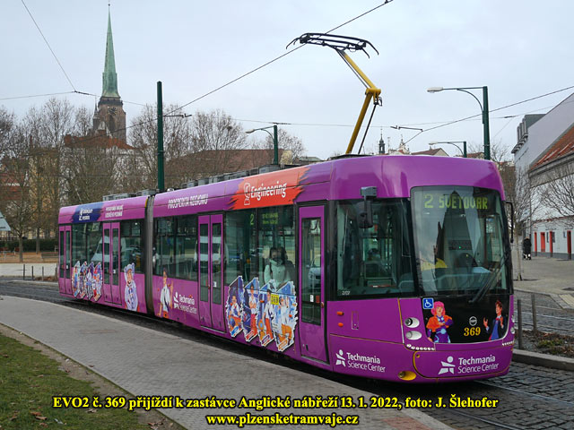 Na snímku je zachycena při příjezdu k zastávce Anglické nábřeží 13. 1. 2022. Reklama je na voze do začátku dubna 2025.