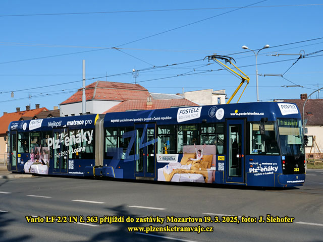 Další nová reklama na "Ince" se objevuje od 19. 3. 2025. Vůz č. 363 propaguje Postele Losiná. Podkladem je velmi tmavě modrý polep.