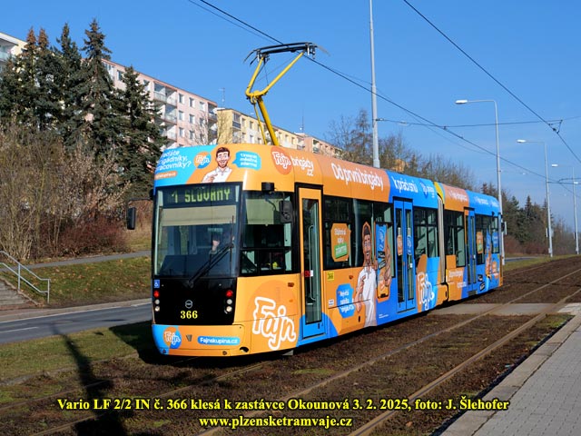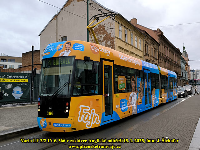 Tentokrát tramvaj Vario LF 2/2 IN (Inka) č. 366 dostala celovozový polep. Veselá modro oranžová kombinace propaguje pracovní portály "Fajn". V provozu je od 15. 1. 2025.