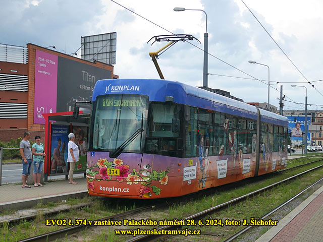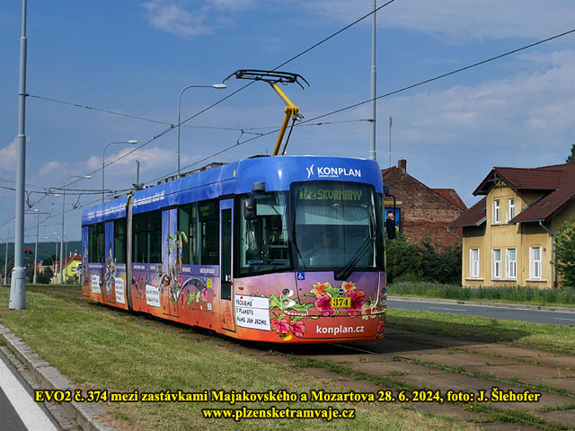 Koncem června 2024 vyjíždí tramvaj EVO2 č. 374 s novou, veselou, reklamou společnosti Konplan. Středněkapacitní vozy jsou nyní nasazovány na výlukové lince 1/2 a tak až do listopadu se také s tímto vozem budeme setkávat zde.