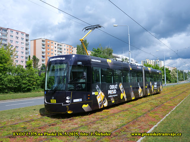 Dne 26. 5. 2025 vyjíždí poprvé vůz č. 375 s reklamou piva Proud. Jak je ze snímku patrné, vůz je převážně v černé barvě.