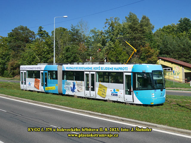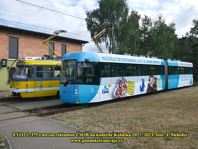 Další nová reklama na tramvaji EVO2, konkrétně na voze č. 375, vyrazila do ulic 20. 7. 2023. Na snímku vlevo je s reklamou ČSOB zachycena na konečné Košutka, během cvičné jízdy, na obrázku vpravo pak již na své domácí lince u boleveckého hřbitova.