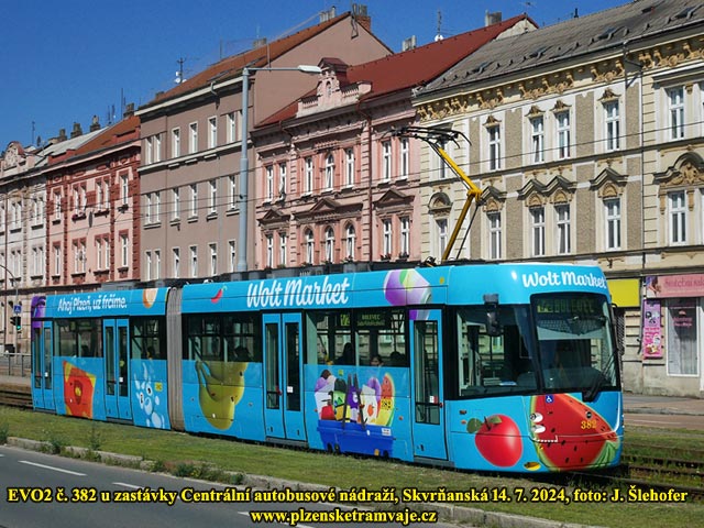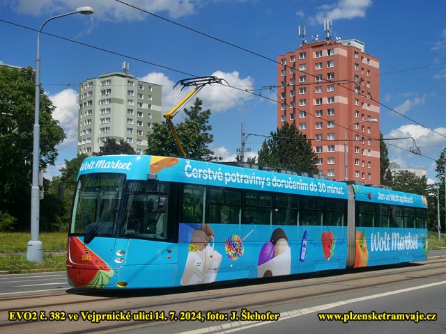 V polovině července 2024 se v provozu objevuje na voze EVO2 č. 382 nová celovozová reklama Wolt Market v modré barvě. Reklama je na voze něco málo přes rok, v říjnu 2025 vyjíždí po střední prohlídce již opět žlutošedá.