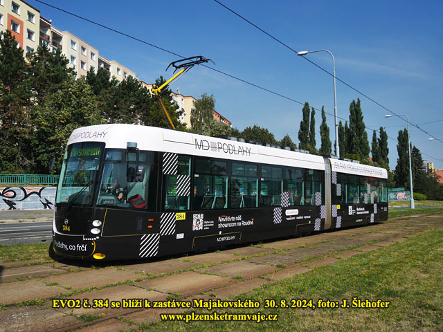 Nová reklama na tramvaji EVO 2 č. 384 je od 30. 8. 2024 v provozu. V převážně černé barvě propaguje MD Podlahy. Na snímku je zachycena při příjezdu k zastávce Majakovského.