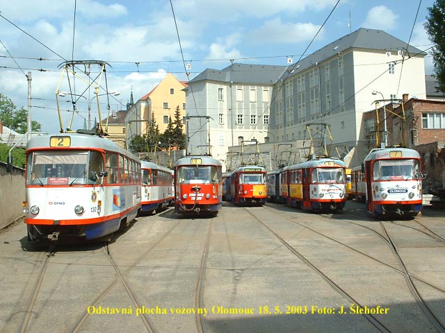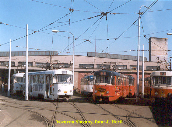 Foto: L. Podivín Soupravy s čelnámi vozyč. 284, 231, 229 ve vozovně Slovany v devadesátých letech