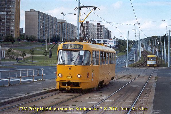 T3M č. 209 v oranžovém nátěru po nerealizované reklamě přijíždí do zastávky Studentská 7. 8. 2001
