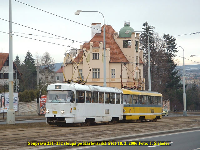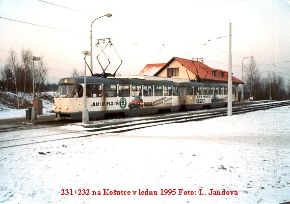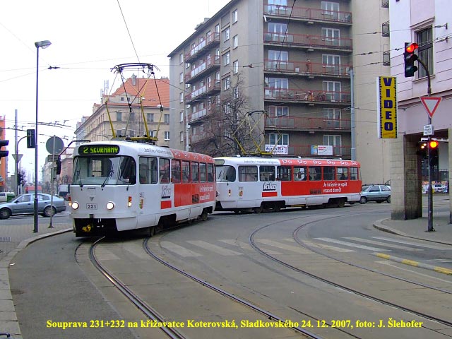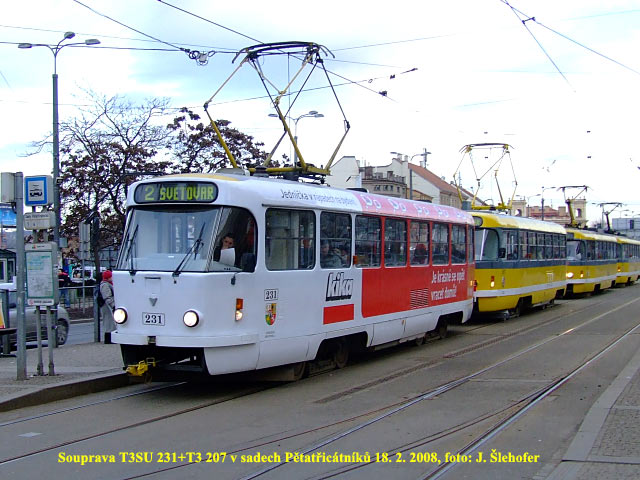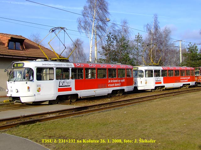 Souprava č. 231+232 na Košutce 26. 1. 2008 Souprava č. 231+232 odbočuje z Koterovské do Sladkovského 24. 12. 2007 Od 4. prosince 2007 jezdím souprava T3SU 231+232 ve světlé červenobílé podobě s reklamou na obchodní dům Kika nábytek. Se stejnou reklamou se na tramvaji můžeme setkat také v Praze a možná i jinde. Pro závadu na voze 232 se v době nedostatku souprav v únoru 2008 objevila v provozu po dobu asi čtyř dnů nezvyklá souprava 231+207.