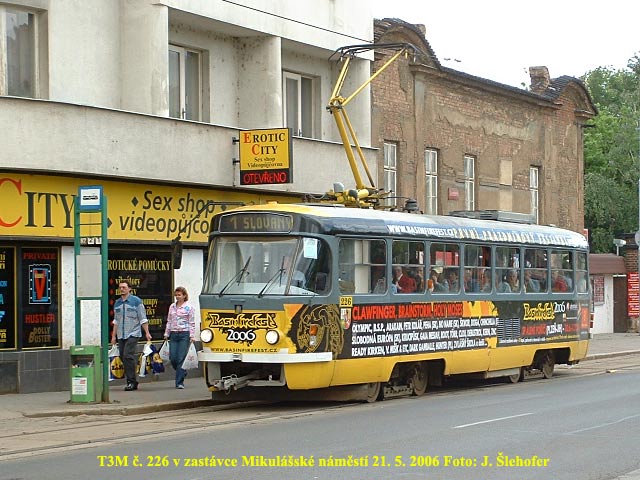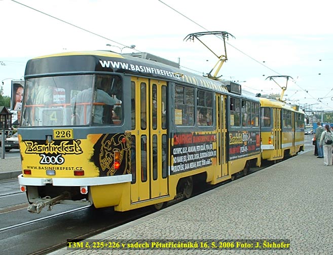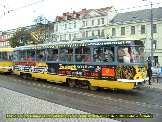 Reklama na Basinfirefest na voze T3M 226 v sadech Pětatřicátníků 16. 5. 2006 Reklama na Basinfirefest na voze T3M 226 v sadech Pětatřicátníků 16. 5. 2006 T3M 226 sólo na lince č. 1 v zastávce Mikulášské náměstí 21. 5. 2006 V úterý 16. 5. 2006 se na soupravě T3M č. 225+226, respektive na jejím zadním voze č. 226 objevila krátkodobá reklama na hudební festival Basinfirefest 2006. Tento den byla nasazena na lince č. 4. O víkendech jsme se pak s ní mohly setkat i sólo na lince č. 1.