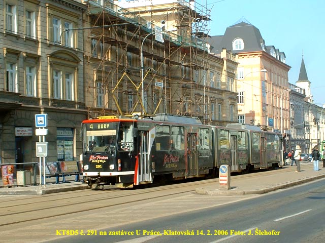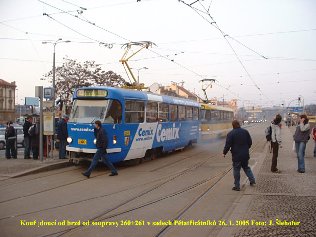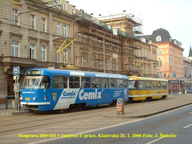 Souprava 260+261 v zastávce U Práce, Klatosvká 26. 1. 2006 Souprava 260+261 v sadech Pětatřicátníků zatahuje do vozovny a kouří se jí od brzd 26. 1. 2006 Vůz č. 260, který vyjel po modernizaci pouze v bílém nátěru, vozí od 25. 1. 2006 modrobílou reklamu na maltové směsy Cemix. Na fotografii vpravo je zachycena zatahující z linky č. 4 s kouřem jdoucím od brzd.
