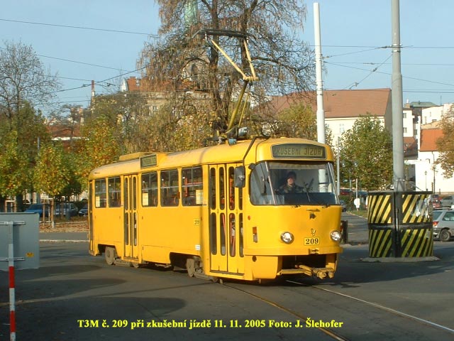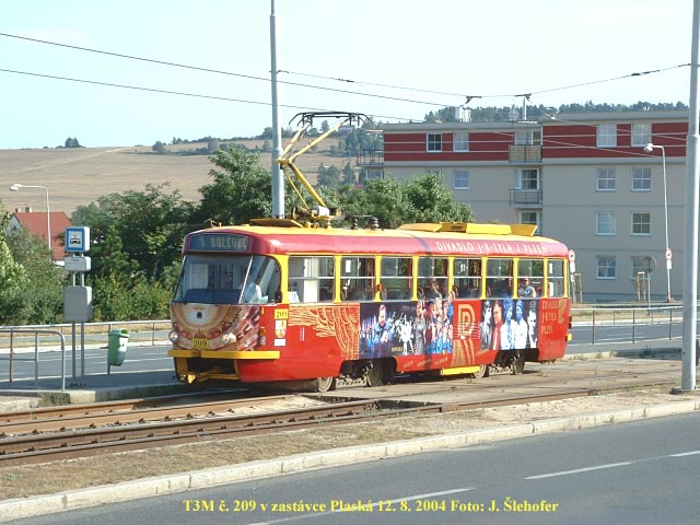Foto: M. Klas T3M č. 209 v zastávce Plaská - 12. 8. 2004 Vůz T3M č. 209, který jezdil tři roky v oranžovém nátěru (pozůstatek nerealizované reklamy - foto vpravo) propaguje od 12. 8. 2004 divadlo J. K. Tyla. Na fotografii vlevo je zachycen s novými bytovkami právě dokončenými ve Studenstké ulici. V listopadu 2005 vyjel tento vůz opět v původním oranžovém nátěru.