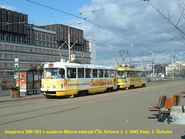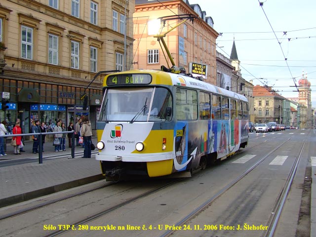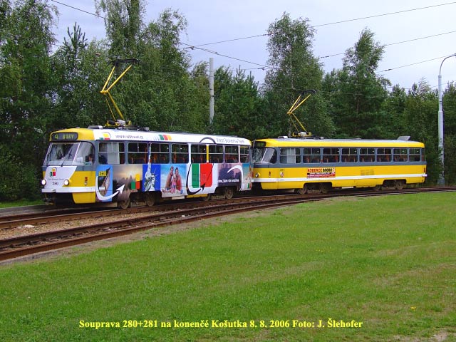 Souprava 280+281 na konečné Košutka 8.8. 2006 V polovině července byla na vůz č. 280 vylepena reklama na cestovní kancelář West Bohemia Travel. Vůz však v té době byl ještě odstaven pro poruchu a tak se reklama v ulicích objevila někdy kolem 27. 7. 2006.