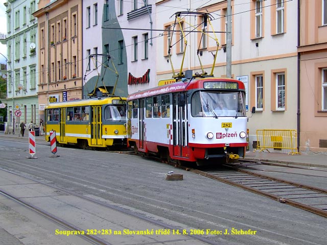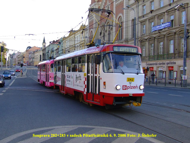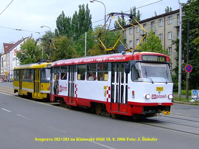 Souprava 282+283 na Klatovské třídě 10. 8. 2006 Souprava 282+283 na Slovanské třídě 14. 8. 2006 Od 10. 8. 2006 má vůz č. 282 ze soupravy 282+283 celovozovou reklamu propagující město Plzeň. Na voze se budou na bílých plochách objevovat ještě aktuální reklamy. V podobném provedení vůz jezdil do druhé poloviny června 2008.