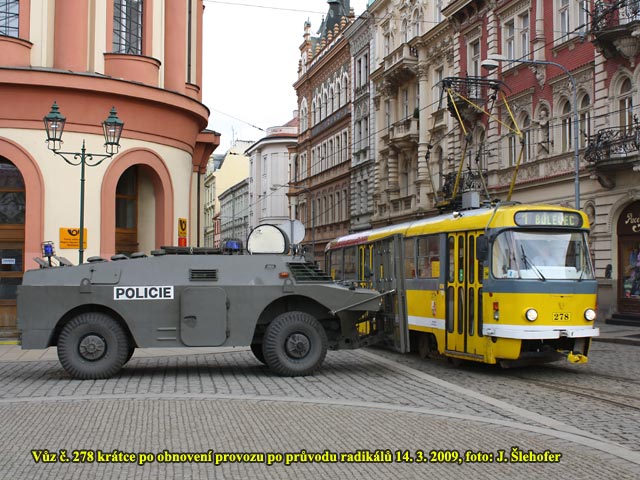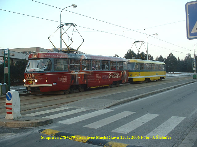Souprava 278+279 v zastávce macháčkova 23. 1. 2006 Souprava 278+279 v Pražské ulici 28. 1. 2006 Na voze 278 (ze soupravy 278+279) se v souvislosti s blížícími se Smetanovskými dny objevila 20. 1. 2006 reklama na Plzeňskou filharmonii. Na fotografii je zachycena v zastávce Macháčkova.
