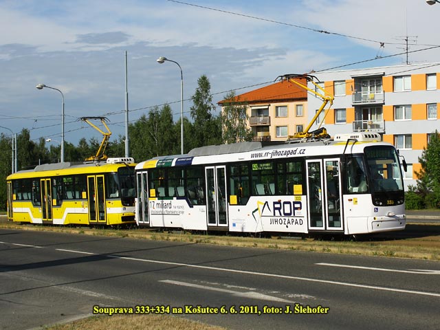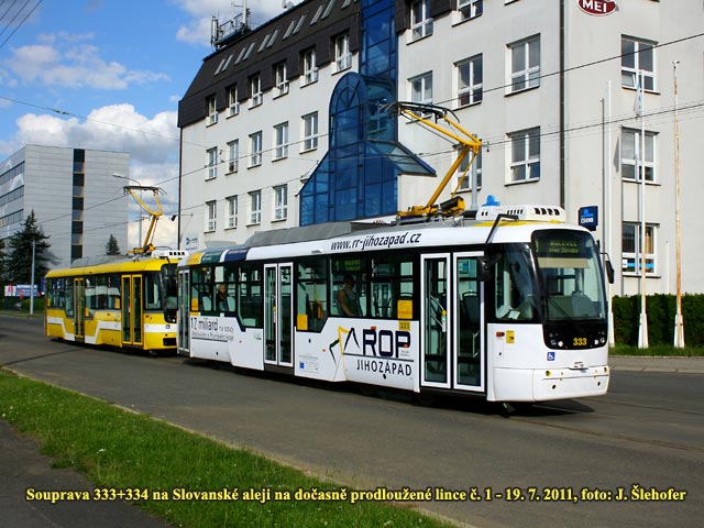 Souprava Varií 333+334 na Košutce 6. 6. 2011 Souprava Varií 333+334 na Slovanské aleji 19. 7. 2011 V polovině května 2011 dostává Vario č. 333 reklamu na Regionální operační program (ROP) Jihozápad. Poměrně nezajímavá reklama s převládající bílou barvou je tak na jednom z vozů, které byly pomocí dotací z fondů EU financovány. Později pak jezdí Varia spojené v soupravě vozů 334+335 a lichým vozem zůstává právě 333 s reklamou a jezdí tedy převážně jen sólo.