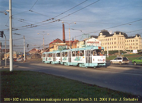 101+102 projíždí kolem nádraží 3. 11. 2001. V pozadí nově opravená budova soudu (Hamburk) 101+102 projíždí kolem nádraží 10. 4. 2002. V pozadí nově opravená budova soudu (Hamburk) Koncem října (v provozu přesně od 1. 11. 2001), dostala souprava 101+102 novou reklamu na nákupní centrum Plzeň, známější spíše pod názvem velké Tesco. Nátěr byl hodně světlý s nádechem zelené. Na fotografii jsou pěkné i zelené sběrače a kola. Ty později již tak pěkně nesvítily. Škoda jen, že byla vybrána tato souprava, která měla celkem nový plzeňský nátěr. Naštěstí se jí po dvou letech vrátil a nyní již opět jezdí v žlutošedém kabátě.