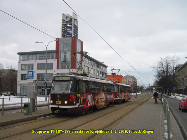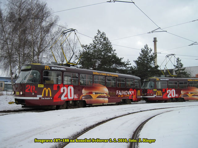 Souprava T3 č. 187+188 v zastávce Krejčíkova 2. 2. 2010, foto: J. Rieger Souprava T3 č. 187+188 na Světovaru 2. 2. 2010, foto: J. Rieger Od pondělí 1. 2. 2010 se pak v ulicích objevuje reklama na "Fajnovky" od McDonald's. Nosičem je souprava T3 č. 187+188. Reklama je na vozech přesně rok a od února 2011 je souprava opět žlutošedá.