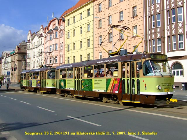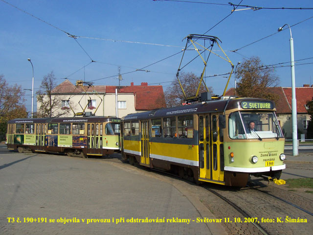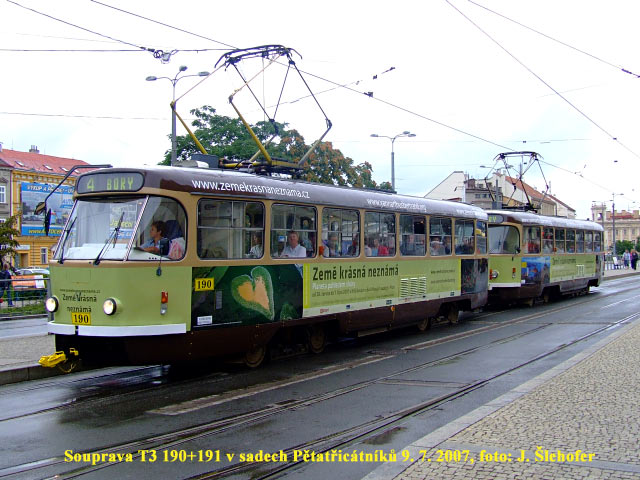 Souprava T3 č. 190+191 v sadech Pětatřicátníků s reklamou výstavy Země krásná neznámá - první (deštivý) den v provozu - 9. 7. 2007 Souprava T3 č. 190+191 na Klatovské třídě s reklamou výstavy Země krásná neznámá 11. 7. 2007 V pondělí 9. 7. 2007 vyrazila na linku č. 4 v novém kabátě souprava 190+191. Vozila na sobě reklamu na výstavu fotografií "Země krásná neznámá", která probíhá od 28. června do 7. října pod širým nebem v Křižíkových a Šafaříkových sadech. Začátkem října se tedy vrátila souprava postupně do své původní podoby, ačkoliv k vůli nedostatku souprav vyjížděla na šejdry i v průběhu sloupávání.
