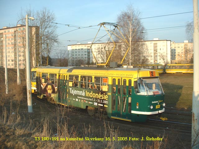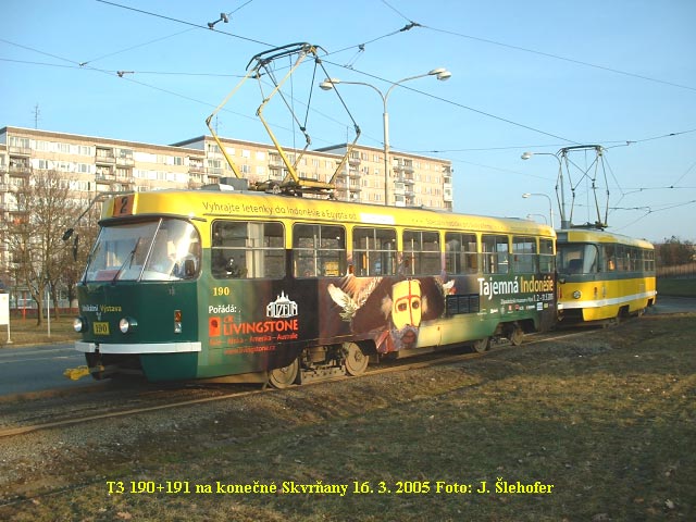 190+191 na konečné Skvrňany 16. 3. 2005 190+191 na konečné Svrňany 16. 3. 2005 V úterý 16. 3. 2005 vyjela souprava T3 č. 190+191, respektive vůz 190 s reklamou na výstavu Tajemná Indonésie. Převažuje zelená barva a tak trochu připomíná reklamu na ZOO. Zajímavostí je to, že se jedná i o první z vozů s vnitřní reklamou stejného inzerenta. V reklamní boxech jsou fotografie a reklamy na zmiňovanou výstavu. Zajímavostí je i to, že se jedná o první jen krádkodobou reklamu (3 měsíce) po dobu konání výstavy v Západočeském muzeu. Fotografie pochází z konečné Skvrňany.
