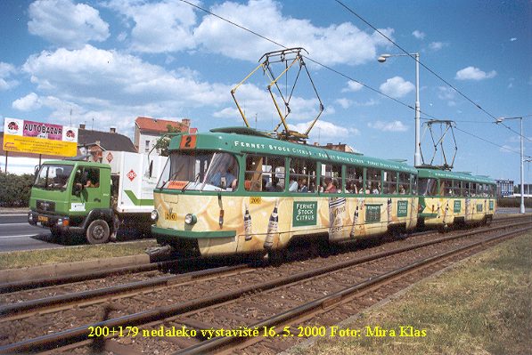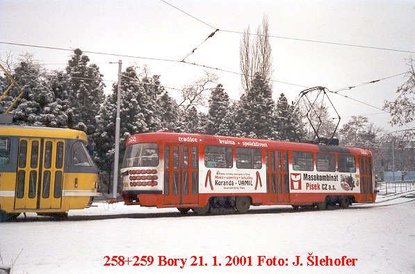 Souprava 200+179 s reklamou na Fernet Citrus 16. 5. 2000. 258+259 (Buřtík) na konečné Bory A zde jsou jedny z nejoblíbenějších. Jídlo a pití vždy vede. Bohužel populárním "citrónkem", či "Fernet expresem" se už nesvezeme. Slabou útěchou byla další verze reklamy na Fernet Orange na soupravě 262+263 viz níže. V pravo je pak "Buřtík", ke kterému později přibyl bratříček v podobě vozu 282.