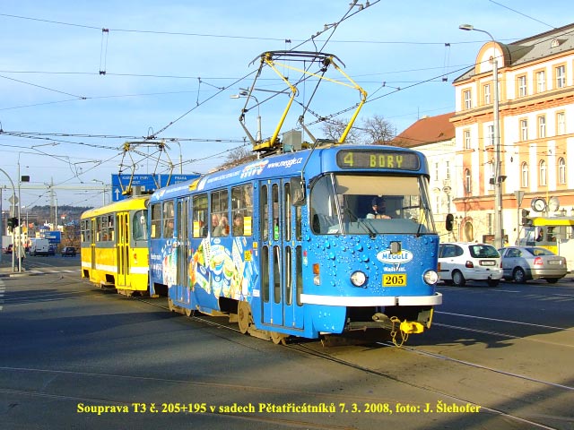 205+195 přijíždí k nádraží 9. 3. 2008 205+195 v sadech Pětatřicátníků 7. 3. 2008 Od 13. 2. 2008 vozí vůz č. 205 (ze soupravy 205+195) modrou reklamu na mléčné výrobky Meggle.