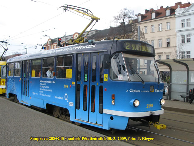 Souprava 208+245 s novou reklamou 02 na voze 208 v sadech Pětatřicátníků 30. 3. 2009, foto> J. Rieger Souprava 208+245 na Slovanské aleji 24. 4. 2009 Další modrá reklama se objevuje 30. 3. 2009 na voze 208. Jedná se o reklamu telefonního operátora O2 v podobném provedení, jako bývala na voze KT8D5 č. 294.