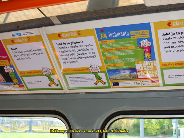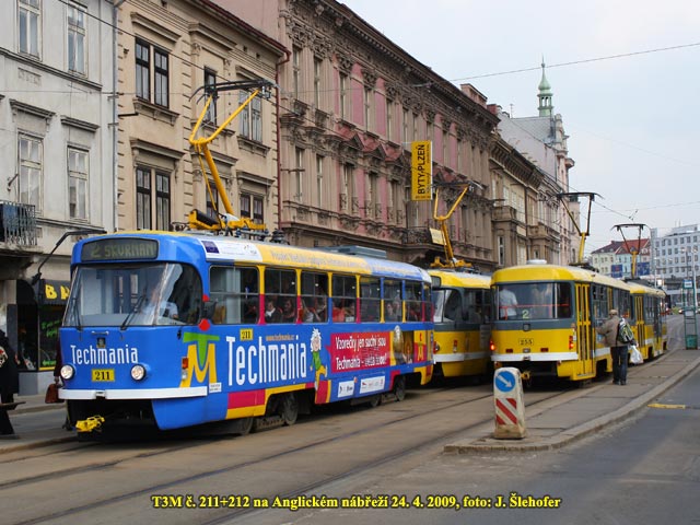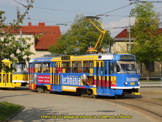Souprava 211+212 přijíždí na Světovar 24. 4. 2009 Souprava 211+212 na Anglickém nábřeží 24. 4. 2009 Vůz T3M č. 211 (+212) vyjíždí s reklamou na muzeum Techmánia konečně od 23. 4. 2009. Reklama byla již instalována dříve avšak vůz nebyl z technických důvodu vypraven do provozu. Již v úterý 7. 4. 2009 byla Reklamní boxy v T3M č. 211 zaplnily kvízové otázky a reklama na Techmánii 24. 4. 2009 v areálu vozovny malá tisková konference, kde Techmánia představila či "tlačila" do médií reklamu, upozorňujíce na kvízovou část uvnitř vozu. V reklamních boxech jsou totiž umístěné otázky, na které najdou cestující odpovědi na jiném místě vozu.