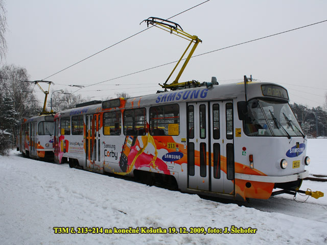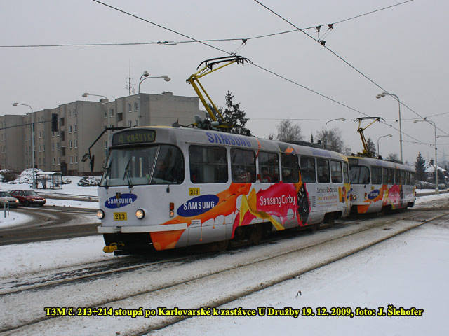 T3M č. 221+222 v zastávce Mozartova 19. 12. 2009 T3M č. 213+214 v křižovatce U Družby 19. 12. 2009 T3M č. 213+214 na Košutce 19. 12. 2009 V prosinci 2009 pak vyjíždí dvě soupravy T3M s celovozovým polepem Samsung (č. 213+214 a 221+222). Ten je na voze něco málo přes rok a začátkem roku 2011 již jsou vozy opět žlutošedé.