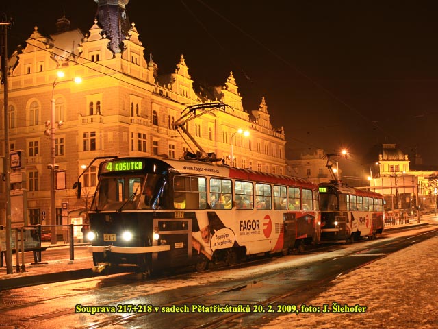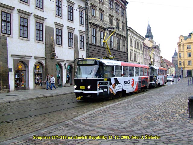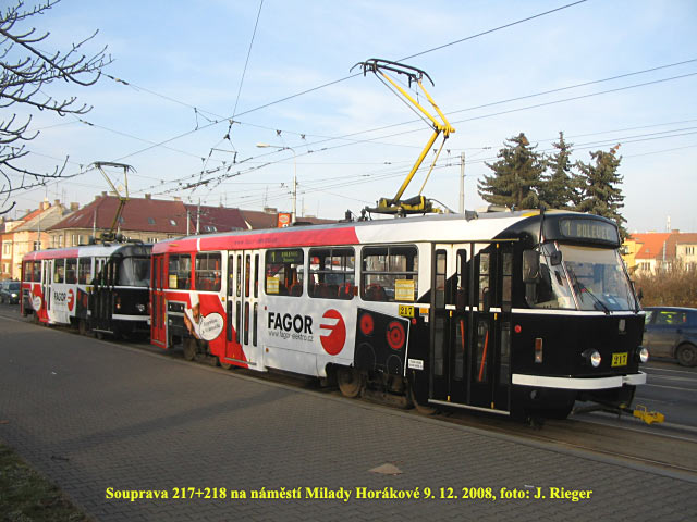 Souprava 217+218 s reklamou Fagor v sadech Pětatřicátníků 20. 2. 2009 Souprava 217+218 s reklamou Fagor na náměstí Republiky 13. 12. 2008 Souprava 217+218 s reklamou Fagor na náměstí Milady Horákové 9. 12. 2008, foto: J. Rieger V pondělí 5. 12. 2008 vyjíždí souprava 217+218 v novém celovozovém kabátě. Oba vozy propagují elektro spotřebiče Fagor. Stejné reklamy se objevují i v dalších městech.