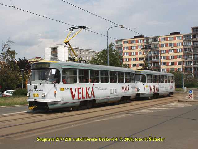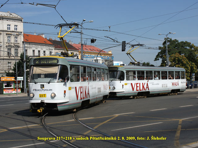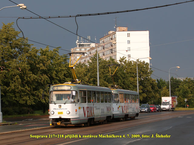 Souprava 217+218 v ulici Terezie Brzkové 4. 7. 2009 Souprava 217+218 přijíždí do zastávka Macháčkova s bouřkovou oblohou v pozadí 4. 7. 2009 Souprava 217+218 přijíždí v sadech Pětatřicátníků 2. 8. 2009 Od pátku 3. 7. 2009 vozí na sobě souprava 217+218 šedou reklamu Banco Popolare. Souprava donedávna jezdila v černočerveném kabátě Fagor.