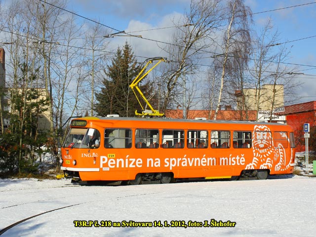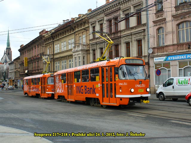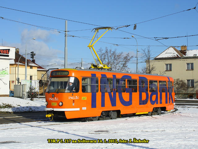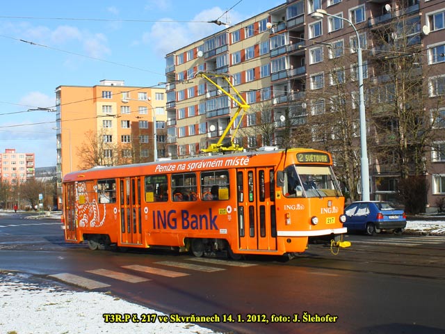 Vůz č. 217 s novou reklamou ING Bank na Světovaru 14. 1. 2012 Vůz č. 217 s novou reklamou ING Bank ve Skvrňanech 14. 1. 2012 Vůz č. 218 s novou reklamou ING Bank na Světovaru 14. 1. 2012 Souprava 217+218 v Pražské ulici 24. 1. 2012