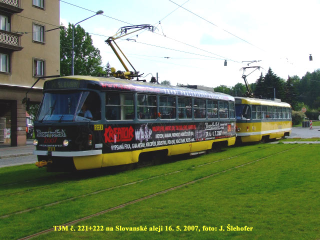 Souprava T3M č. 221+222 na Slovanské aleji 16. 5. 2007 Po delší době se v provozu objevila nová reklama. Jedná se podobnou jako v loňském roce na festival Basinfirefest. Dlouho se tedy na voze neohřeje.