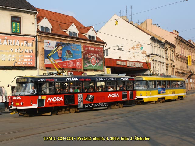 Souprava 223+224 v sadech Pětatřicátníků 6. 4. 2009 Souprava 223+224 v Pražské ulici 6. 4. 2009 V pondělí 6. 4. 2009 vyjíždí také v Plzni další "celostátní" celovozová reklama. Vůz T3M 223 (ze soupravy 223+224) propaguje v červenočerné kombinaci elektrospotřebiče Mora. Doba reklamy je jeden rok a od dubna 2010 je opět v původní žlutošedé podobě.