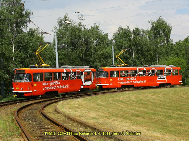 Souprava T3M č. 223+224 s novou reklamou Kika na Košutce 4. 6. 2011 Vůz T3SU č. 231 v poslední den svého provozu 7. 5. 2011 Koncem dubna 2011 se objevuje na T3M č. 223+224 nová reklama na nábytek Kika. Oproti předchozí na vozech 231+232 (jejichž konec se blíží) na 223+224 je více červené. Teoreticky se obě soupravy Kika mohly cca dva týdny setkávat současně v provozu, avšak T3M č. 223+224 stála ihned po vylepení reklamy několik týdnů se závadou a tak 231+232 byla vyřazena, aniž by je spolu v ulicích bylo možné vyfotit (vůz 231 naposledy v provozu 7. 5. 2011).
