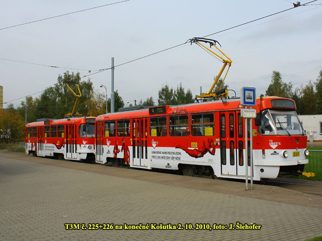 Souprava T3M č. 225+226 na konečné Košutka 2. 10. 2010 Souprava T3M č. 225+226 projíždí kolem Družby 2. 10. 2010 Po delší době se na objevuje nová celovozová reklama. Souprava T3M č. 225+226 jezdí od 29. 9. 2010 v červeno bílé barevné podobě propagující prodejny Albert a její v kampani se objevující cenové agenty.