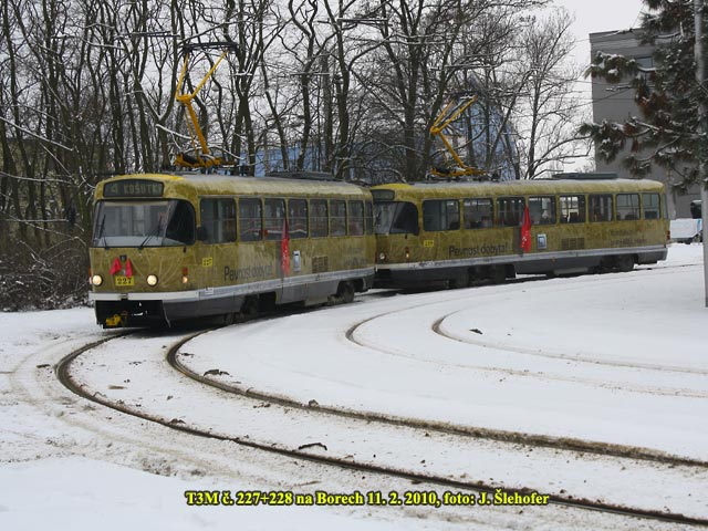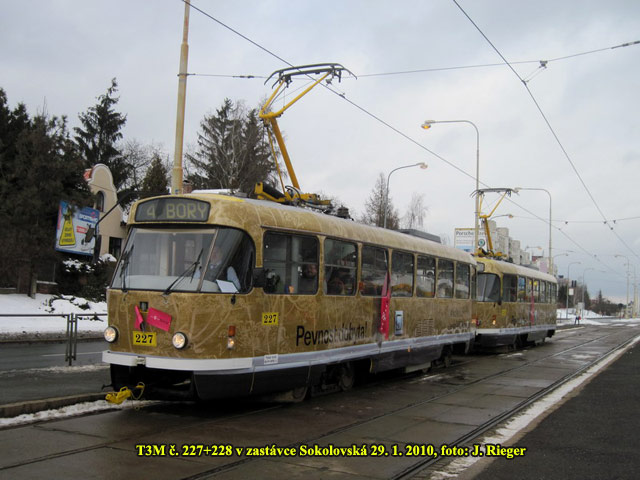 Souprava T3M č. 227+228 v zastávce Sokolovská 29. 1. 2010, foto: J. Rieger Souprava T3M č. 227+228 na Borech 11. 2. 2010 Nová avšak ne příliš výrazná reklama se objevuje 29. 1. 2010 na soupravě T3M č. 227+228. Inzertem je T-Mobile, i když na první pohled to není úplně patrné. I tahle reklama je na vozech přibližně rok a v únoru 2011 jsou vozy již bez reklamy.