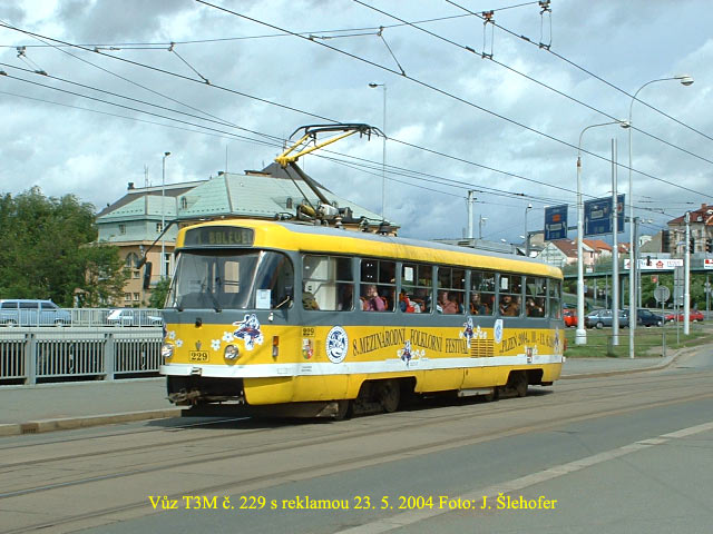 109+110 se reklamou na ZOO v zastávce Hlavní nádraží ČD, Sirková - 7. 5. 2004 T3M č. 229 s reklamou na folklórní festival na mostě U Jána 23. 5. 2004 Nová vcelku zajímavá reklama se objevila na EX mostecké tramvaji č. 109. Fotografie zvířat lákají do plzeňské zoologické zahrady. V provozu je od 6. 5. 2004. Na snímku pořízeném o den později je zachycena v zastávce Hlavní nádraží ČD, Sirkova. Později se na zadním voze této soupravy objevila reklama na Dinopark. Zřejmě krátkodobá reklama se objevila v půlce května na voze T3M č. 229. Informuje o osmém mezinárodním folklórním festivalu v Plzni. Na fotografii je zachycena no mostě U Jána.