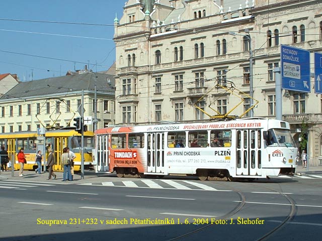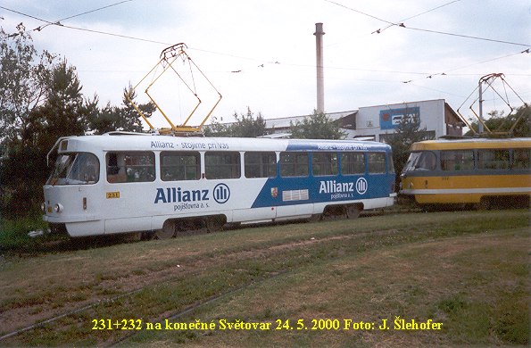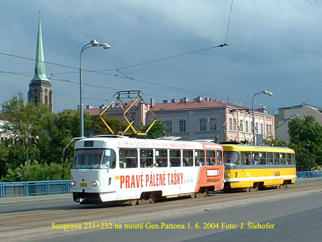 231+232 na mostě Generála Pattona - 1. 6. 2004 231+232 v sadech Pětatřicátníků - 1. 6. 2004 Po odstranění reklamy Alianz z vozu 232 (souprava 231+232) jezdil tento vůz krátce v bílém kabátě. Od 1. 6. 2004 však na sobě vozí opět reklamu, tentokrát firmy První chodská a střešních kritin Tondach. V této podobě jezdi vůz do konce roku 2005. Nyní je bílý.