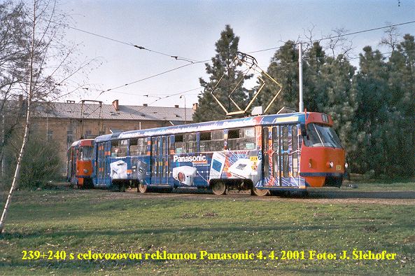 Panasonic na Borech Panasonic na tankodromu v sadech Pětatřicátníků - únor 2002 Od 3. dubna 2001 byla v provozu souprava 239+240 s celovozovou reklamou na elektrospotřebiče Panasonic. Fotografie vlevo pochází z konečné Bory krátce po vylepení reklamy, vpravo pak téměř o rok později v Sadech Pětatřicátníků. Dnes je již opět v plzeňském žlutošedém nátěru.