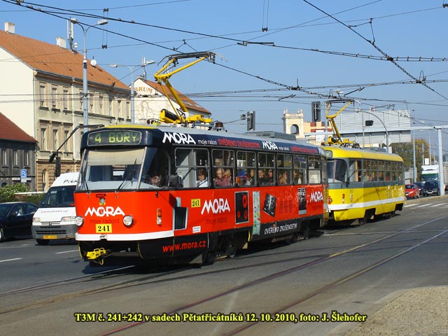 Souprava T3M č. 241+242 v sadech Pětatřicátníků 12. 10. 2010 Jen po dalších pár dnech vyjíždí další vůz s celovozovou reklamou. Je jím 4. 10. 2010 T3M č. 241 (ze soupravy 241+242) a propaguje elektrospotřebiče Mora. Jedná se o téměř stejnou reklamu jako byla od dubna 2009 do dubna 2010 na voze 223.