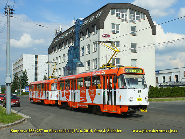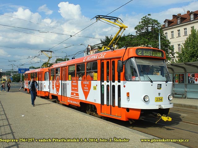 Souprava 256+257 v sadech Pětatřicátníků 3. 6. 2014 Souprava 256+257 na Slovanské aleji při zátahu do vozovny 3. 6. 2014 Souprava T3R.P č. 256+257 dostala nový oranžovobílý polep Skupiny ČEZ. V provozu je od 3. 6. 2014, avšak pouze po dobu přibližně jednoho roku.