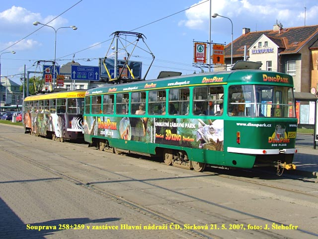 Foto: K. Šimána Souprava 258+259 v zastávce Hlavní nádraží ČD, Sirová 21. 5. 2007 Po instalaci informačního systému Buse vyjela dne 16. 5. 2007 souprava 258+259 s novou reklamou na Dinopark na zadním voze. Souprava je tak ve stejné podobě jako v září 2005 dojezdila souprava 109+110, tedy přední vůz s reklamou ZOO a zadní Dinopark.