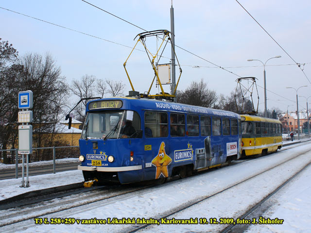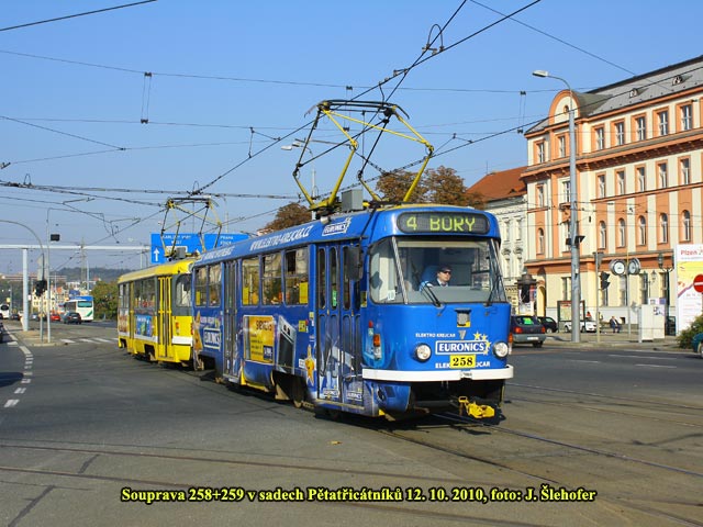 Souprava 258+259 v zastávce Lékařská fakulta, Karlovarská 19. 12. 2009 Souprava 258+259 v sadech Pětatřicátníků 12. 10. 2010 Na prvním voze soupravy 258+259 se v listopadu 2009 objevuje reklama na elektro Euronics. I díky reklamě tak bude tato souprava v Plzni patrně jednou z posledních zrychlovačových souprav v provozu.