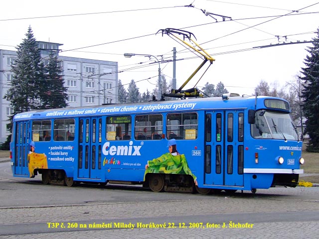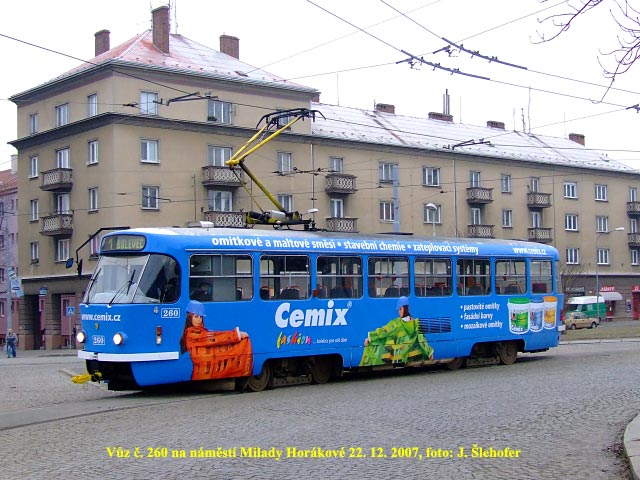Vůz č. 260 na náměstí Milady Horákové 22. 12. 2007 Vůz č. 260 na náměstí Milady Horákové 22. 12. 2007 Koncem listopadu vyjel vůz č. 260 po sloupání reklamy v bílém nátěru (při modernizaci se s reklamou počítalo a vůz dostal jen bílý nátěr). V bílém však nejezdil dlouho, neboť od 18. 12. 2007 jezdí opět s modrou inovovanou reklamou Cemix.