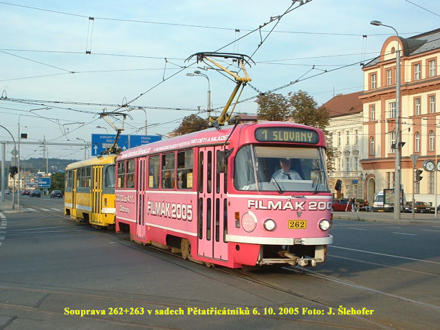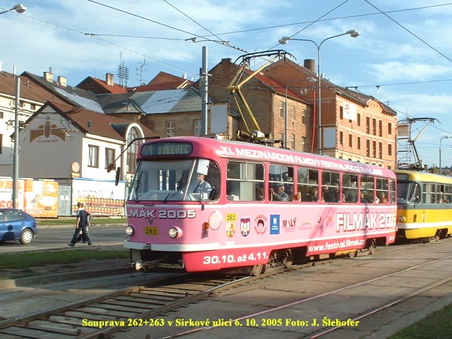 Souprava 262+263 v sadech Pětatřicátníků 6. 10. 2005 Souprava 262+263 v Sirkové ulici 6. 10. 2005 Vůz 262 ze soupravy 262+263 jezdí od 5. 10. 2005 v růžové podobě s povedenou reklamou na 11. ročník filmového festivalu pro děti a mládež Filmák 2005. Ne na dlouho, po měsíci již je tramvaj opět žlutošedá. Tento vůz měl růžový kabátek již podruhé. V roce 2002 měla totiž celá souprava reklamu na T-mobile.