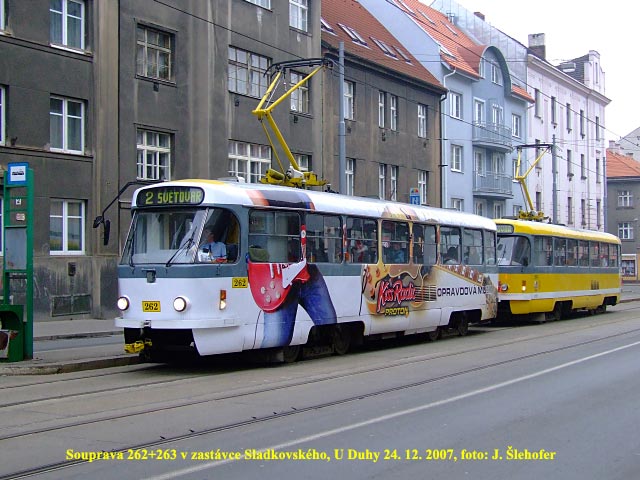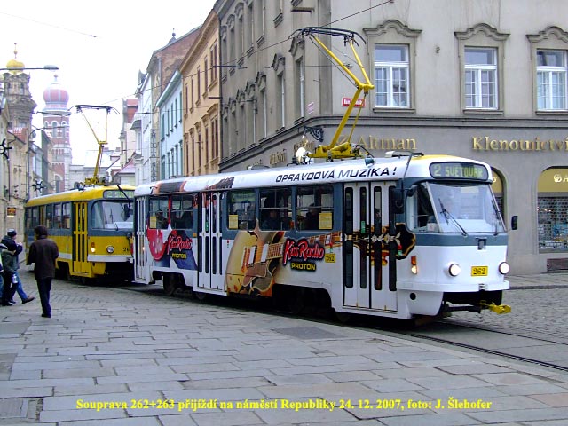 Souprava 262+263 v zastávce Sladkovského U Duhy 24. 12. 2007 Souprava 262+263 přijíždí na náměstí Republiky 24. 12. 2007 O pár dní později vyjíždí T3P č. 262 s reklamou rádia Kiss Proton. Tentokrát je ve světlém provedení, oproti dřívějším černým verzím. Reklama však na voze není ani rok. Vůz je v září poškozen na boku při nehodě s dodávkou a po opravě v polovině října již vyjíždí bez reklamy.